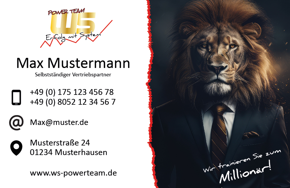 - Design: Vorderseite mit dem schönen WS Power Team Logo, Rückseite mit dem Firmenlöwen und Ihren Kontaktdaten